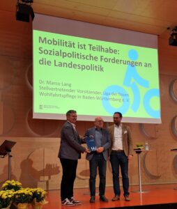 Am 7. November 2025 fand dazu die Abschlusstagung im Hospitalhof in Stuttgart statt. Verkehrsminister Hermann hielt das Eingangsreferat. Pressetext Verkehrsministerium BW Anschließend sprach Herr Lang von der LIGA der freien Wohlfahrtspflege zum Thema: Mobilität ist Teilhabe. Er übergab einen sozialpolitischen Forderungskatalog an die Landespolitik an den Minister. Forderungen der LIGA